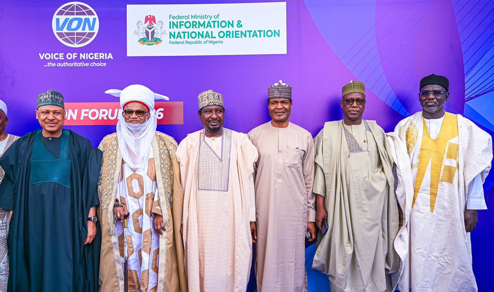 (L–R) The Honourable Minister of Information and National Orientation, Mohammed Idris, fnipr; the Etsu Nupe, Alhaji Yahaya Abubakar; Deputy Senate President of Nigeria, Senator Jibrin Barau, CFR; Director-General, Voice of Nigeria (VON), Mallam Jibrin Baba Ndace; Senator Sani Bello; and former Chief of Army Staff, Ambassador Yusuf Tukur Buratai, during the Voice of Nigeria Forum 2026, held in Abuja. Photo: Khalid Ahmed/FMINO.
